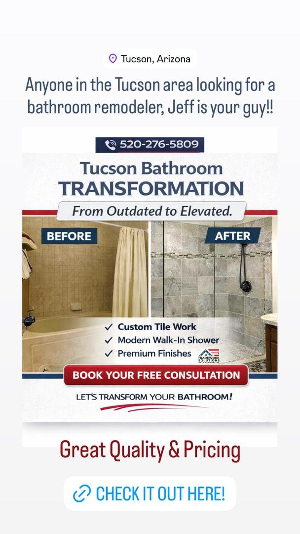 Tradework Solutions is a trusted home improvement company based in Tucson, Arizona, specializing in bathroom remodeling and renovations. We bring skilled craftsmanship, attention to detail, and modern design expertise to every project- transforming outdated bathrooms into beautiful, functional spaces. From full bathroom remodels to custom shower upgrades, our team delivers reliable quality, clear communication, and results that stand the test of time. Homeowners across Tucson and surrounding areas choose Tradework Solutions for honest service, clean workmanship, and a smooth renovation experience from start to finish. Contact us today to schedule your free bathroom consultation.